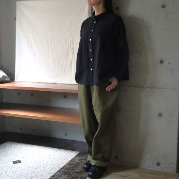 ネップの表情が映えるコットンリネンのシャツ襟付きブラウス。コンパクトな丈感と小ぶりな襟がシャープな印象を与え、シンプルながらもディテールで差がつく一枚。羽織としても、インナーとしても存在感を放ちます。合わせたのは、ヴィンテージ感漂うカツラギニューセリサイトノッポパンツ。ワイドストレートの無骨さと低めポケットのデザインが、自然なルーズ感とこなれた雰囲気を演出。ナチュラルながらもエッジの効いた大人カジュアルを楽しめる組み合わせです。