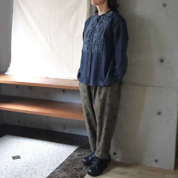 綿麻デニムにフリンジを施したシャツは、一枚でコーデを華やかに見せてくれる主役級アイテム。前身頃と袖口のさりげないフリンジが動きを生み、ナチュラルながらもおしゃれ感をぐっと引き上げます。オリーブ柄の刺繍パンツを合わせれば、シンプルながらも大人の遊び心を感じさせるコーデに。ウエストゴムの快適さとテーパードシルエットが、すっきりと見せつつリラックス感を両立。