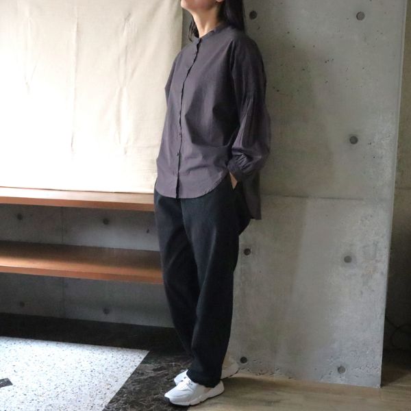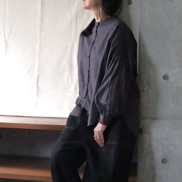 柔らかくて軽いコットン素材。袖と背中のピンタックが立体感を出し、ふんわりシルエットを演出。お尻まですっぽり隠れる丈感で安心感◎。上品なくるみボタンとバンドカラーで顔まわりはすっきり。