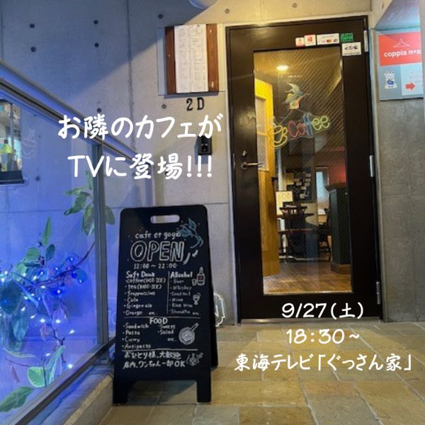 今年の覚王山夏祭では、一緒に【coppia et gogo】としてコラボ出店をさせていただきた、お隣のカフェ【cafe et gogo】が 9/27(土)に「ぐっさん家」で紹介されることになりました!!