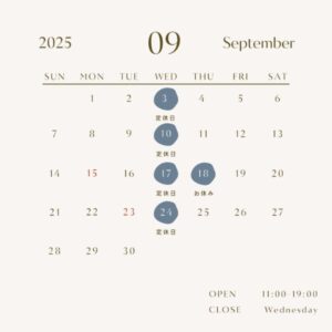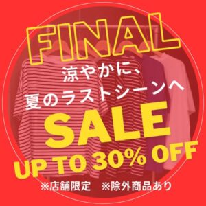 8/29(金)より、サマーセール第三弾が始まります!!店内アイテムは最大 30% OFF に!!!残暑を心地よく過ごす一枚も、秋へつながるお気に入りも、まだまだ揃っています。さらに店頭には、秋物も続々入荷中!! ほんの少 […]
