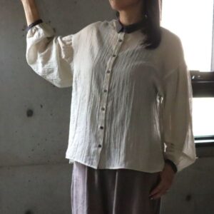 朝の柔らかな日差しの中、さらりと羽織りたくなるブラウス。軽やかなガーゼ素材と小ぶりな衿が織りなす上品な存在感は、残暑を忘れさせてくれます。ころっとしたハトメくるみボタンとゆったりシルエットが愛らしさをプラス。合わせたフレ […]