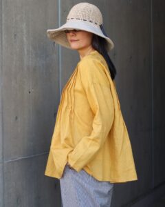やわらかなイエローマスタード色が目を引く、前あきタックブラウス。