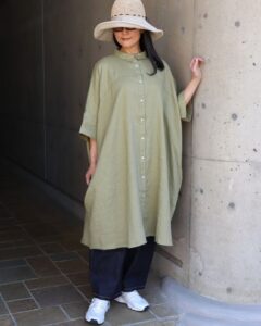 リネン素材のシャツ風チュニックは、通気性と放湿性に優れ、肌に触れたときのやさしさが魅力。