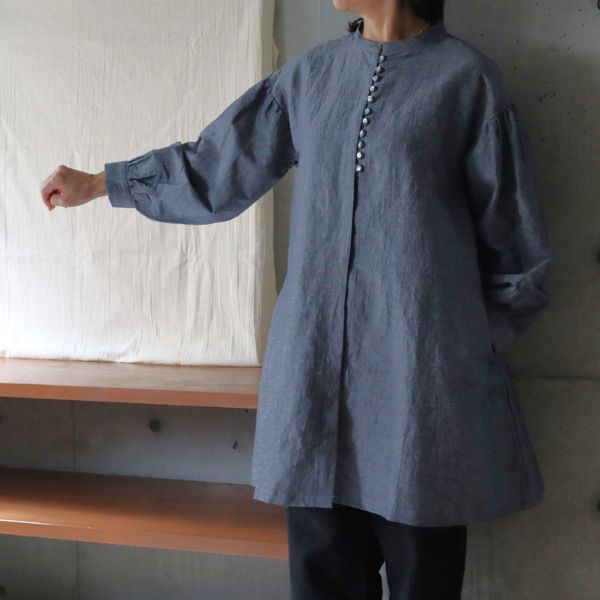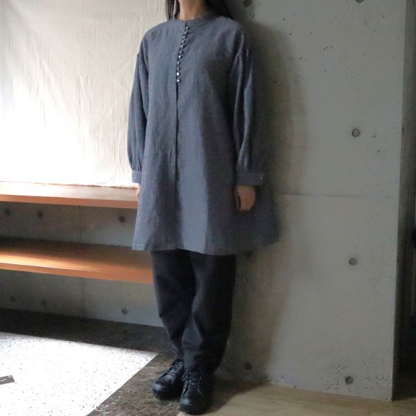 ふっくらとした綿麻オックス生地で仕立てた多ボタンチュニック。フロントに並ぶ小さなボタンがアクセントになり、すっきりとした印象に仕上がっています。ボリューミーな袖にはギャザーを寄せ、ナチュラルな可愛らしさをプラス。一枚で華やぎ、羽織りとしても活躍する万能アイテムです。合わせたのは、シーチングハンドワッシャー素材のコージーパンツ。ゆったり感がありながらも足首にかけてすっきり見せるテーパードシルエット。自然なシワ感と柔らかい肌ざわりが心地よく、動きやすさも魅力です。高めの位置に配されたバックポケットは、さりげなくスタイルアップを演出。ロールアップしてもこなれ感が出て、季節を問わず頼れる一本です。