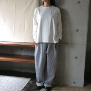 ネップの表情が映えるコットンリネンのシャツ襟付きブラウス。コンパクトな丈感と小ぶりな襟がシャープな印象を与え、シンプルながらもディテールで差がつく一枚。羽織としても、インナーとしても存在感を放ちます。合わせたのは、ヴィン […]